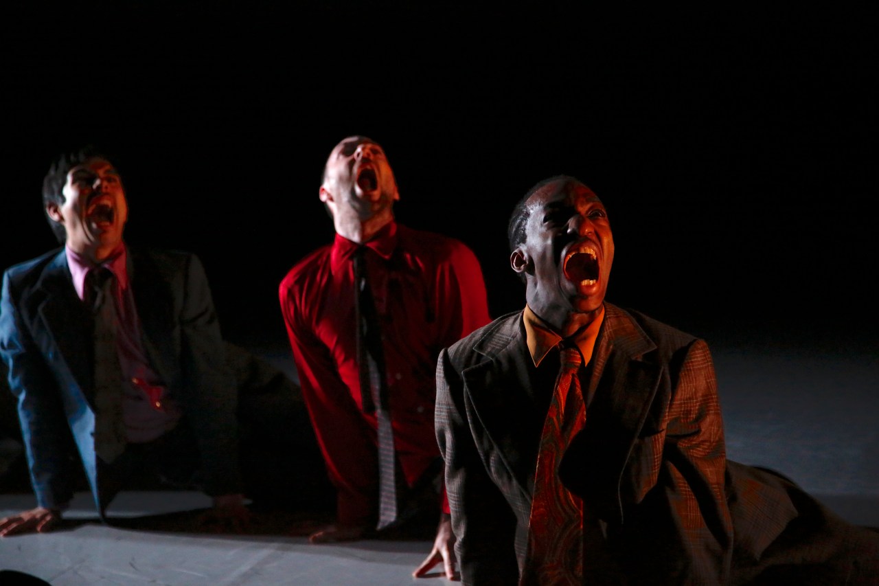 It is a show of many moods, original movement and striking imagery: a frame upon which several narratives could hang. From the bursting entry of five dancers in men’s suits, the clatter of their oxfords on hard floor providing percussion, we sense imminent violence.
