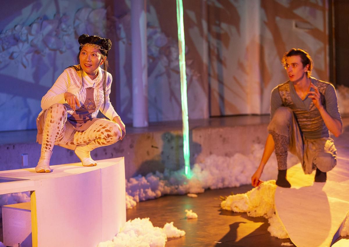 First you need a set that can adapt to worlds only imagined, as the characters move through time and space, legend and reality. This is done with a zig-zagging catwalk above the stage floor, so that the players are either flying or sinking below earth level.